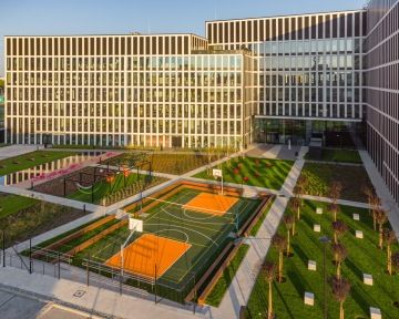Udržitelný přístup se odráží nejen v interiérech obou budov a ve využitích technologiích, ale podtrhuje ho také unikátní nádvoří se společnými zelenými zónami. Ty zahrnují basketbalové hřiště, odpočinkovou část s lavičkami a lehátky či okrasné květinové záhony. Komplex dále disponuje nabíjecími stanicemi pro elektromobily i zázemím pro zaměstnance využívající cyklodopravu.