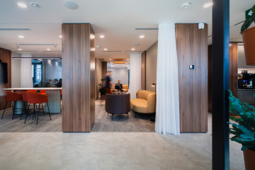 Moderně zařízené kanceláře přináší veškerý komfort. Samozřejmostí jsou i velké zasedací místnosti, plně vybavená kuchyňka nebo recepce.
