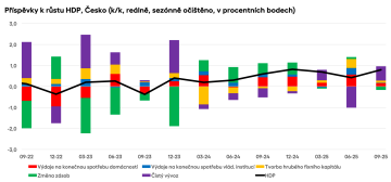 Česká ekonomika nabírá obrátky a nepřestává příjemně překvapovat. Ve třetím kvartálu minulého roku mezičtvrtletně narostla o krásných 0,8 %, což odpovídá meziročnímu zlepšení o 2,8 %, tedy nejvíce od druhého čtvrtletí roku 2022. Stejně jako v předchozím období byla silným tahounem růstu spotřeba domácností, ale nezvykle výrazný byl i příspěvek čistého vývozu služeb a kosmeticky pomohly i zvýšené investice. Celkový výsledek pak předčil i ty nejoptimističtější odhady.