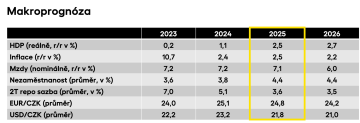 Velmi silné tempo si drží růst mezd, který dosáhl hodnoty 7,1 % nominálně a dalece tak předběhl dynamiku samotné ekonomiky. To vše navzdory zřetelnému ochlazení trhu práce, kde statistika nezaměstnanosti dosahuje po sezónním očištění nejvyšších hodnot od roku 2016. Za tímto vývojem lze patrně hledat primárně nadále neutěšenou situaci v průmyslovém sektoru, který již několik let přešlapuje na místě, a to hlavně vlivem slabé zahraniční poptávky. Tržby v maloobchodu v posledních několika měsících sice zpomalily růstovou dynamiku, z širšího pohledu nicméně zůstávají na vzestupné trajektorii. Mimořádně rozkolísaná pak zůstává spotřebitelská inflace, která střídavě překvapuje směrem nahoru i dolů v závislosti na tom, kam se právě vydají ceny potravin. I nadále přitom platí, že problematické zůstává zdražování služeb, nemovitostí a nájmů, naopak průmyslové zboží na ceně téměř neroste a energie působí deflačně. V závěru roku 2025 očekáváme inflaci v okolí 2,5 %, což pravděpodobně bude i její průměrná výše za celý rok 2025.