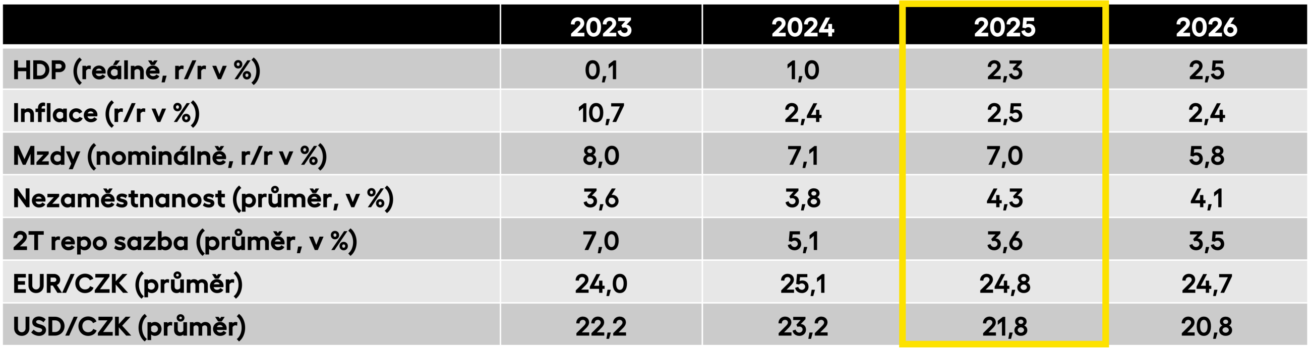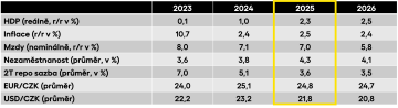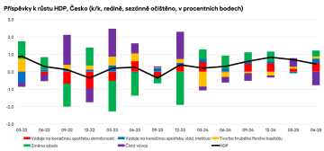 I ve zbytku letošního roku se můžeme spolehnout na pokračující růstový impulz ze strany spotřeby domácností, poháněný zvyšující se kupní silou. Oproti původním předpokladům se k ní patrně přidá alespoň kosmetickým příspěvkem i tvorba hrubého fixního kapitálu. Negativní vliv naopak očekáváme od bilance zahraničního obchodu, kde nadále brzdou zůstává slabý výkon Německa a celní politika Spojených států. V souhrnu pak za celý letošní rok patrně míří k ekonomickému růst o zhruba 2,3 %, v roce příštím pak ještě mírně zrychlí na 2,5 %.