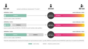 Jestliže byste se rozhodli i přesto odkládat si 4 000 Kč měsíčně a využívat k tomu ještě příspěvek zaměstnavatele např. ve výši 3 000 Kč za měsíc, za 20 let získáte částku 5 209 026 Kč. Ty byste si mohli vybírat formou měsíční renty od 65 do 80 let ve výši 46 822 Kč. Na dani z příjmů byste zaplatili o 144 000 Kč méně, než kdybyste DIP neměli.